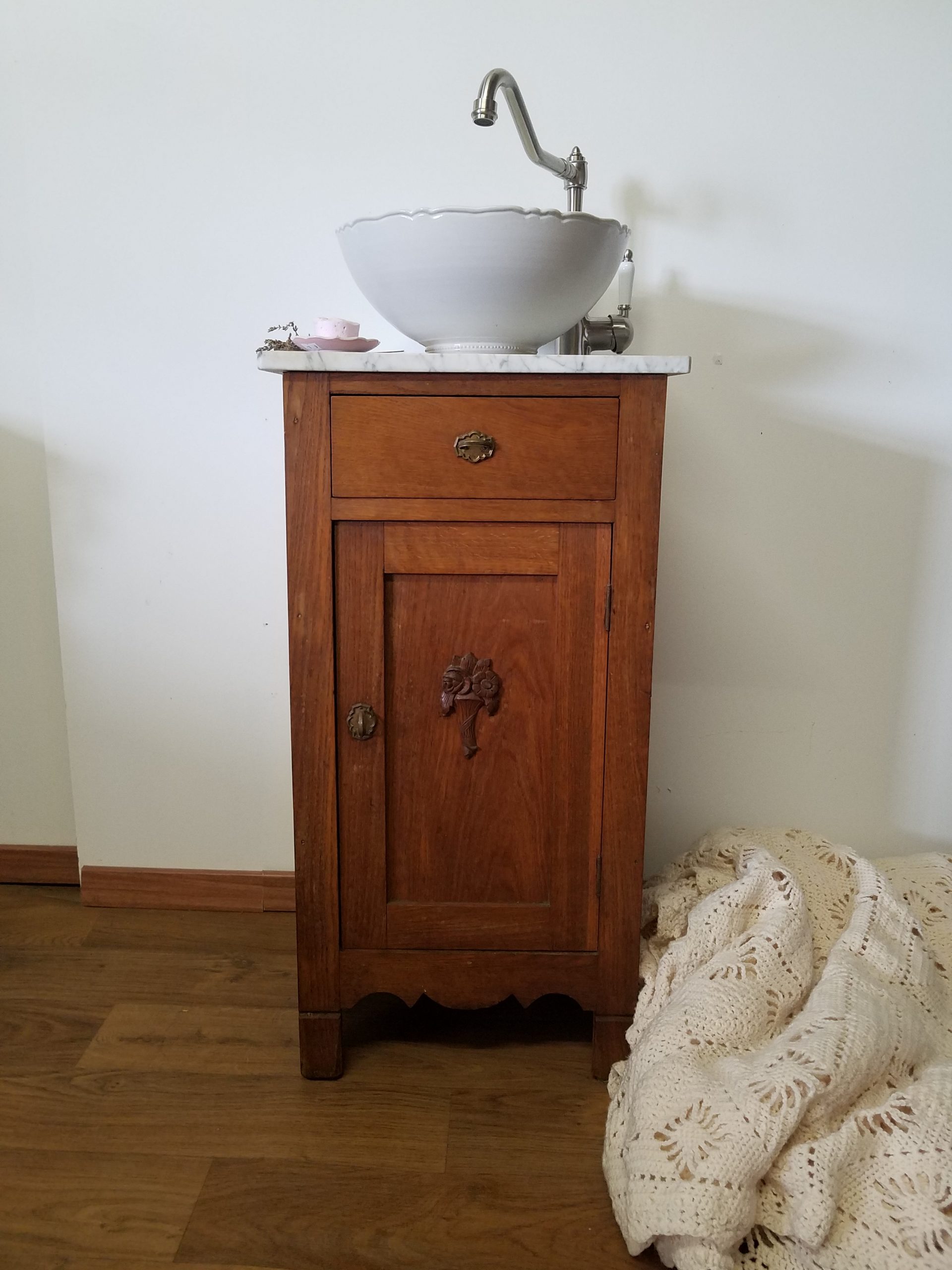 Kleines Badmöbel aus Naturholz mit Marmorplatte