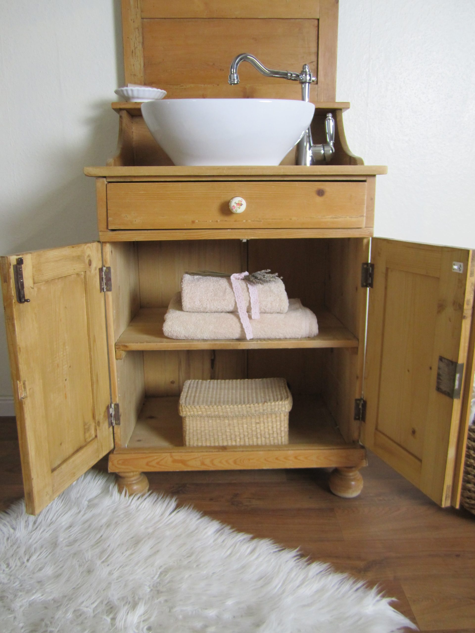 - Nostalgisches Möbelstück mit eigener Geschichte, umgebaut zum Waschtisch Landhaus und angepasst an die Gegebenheiten in Ihrem Badezimmer.