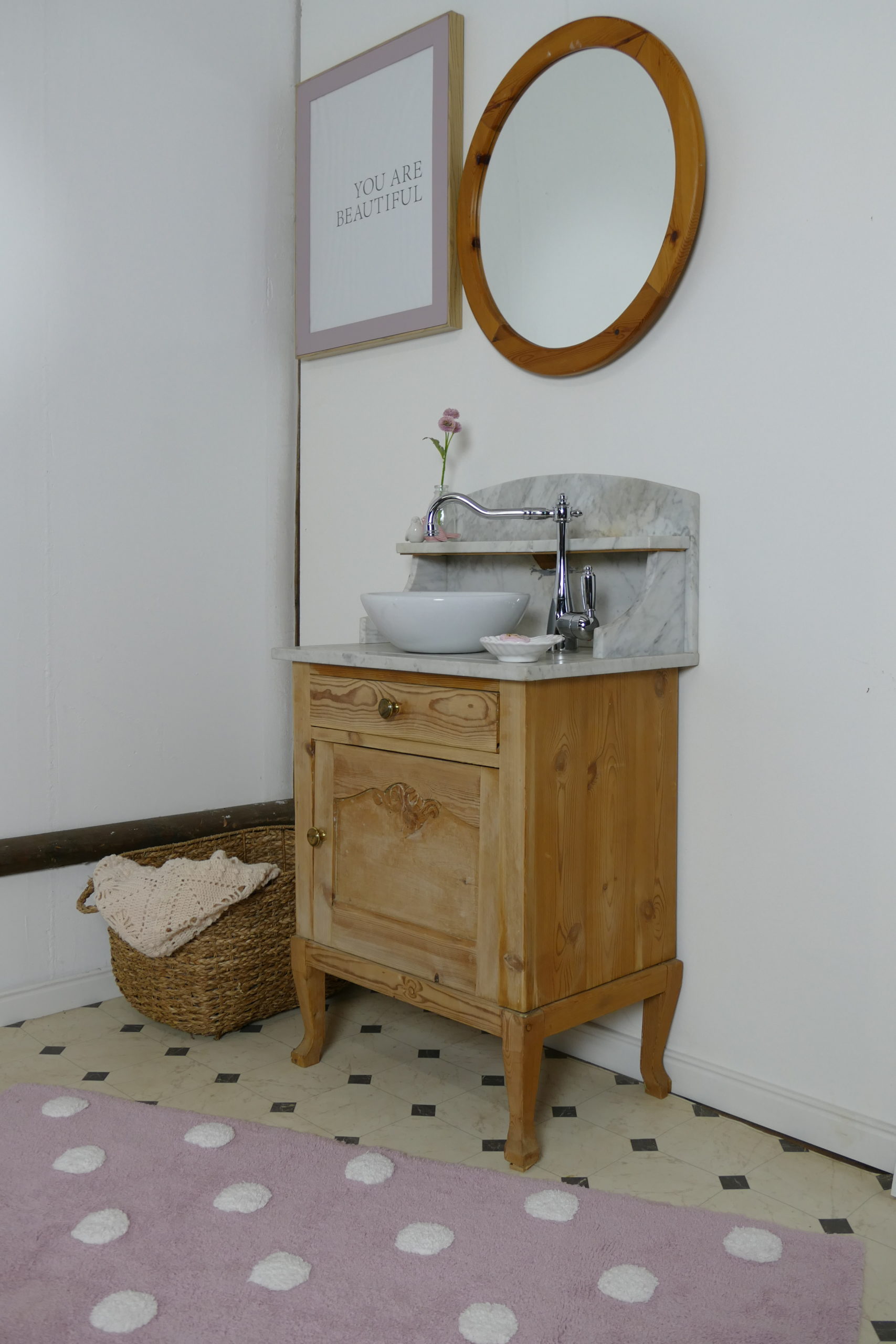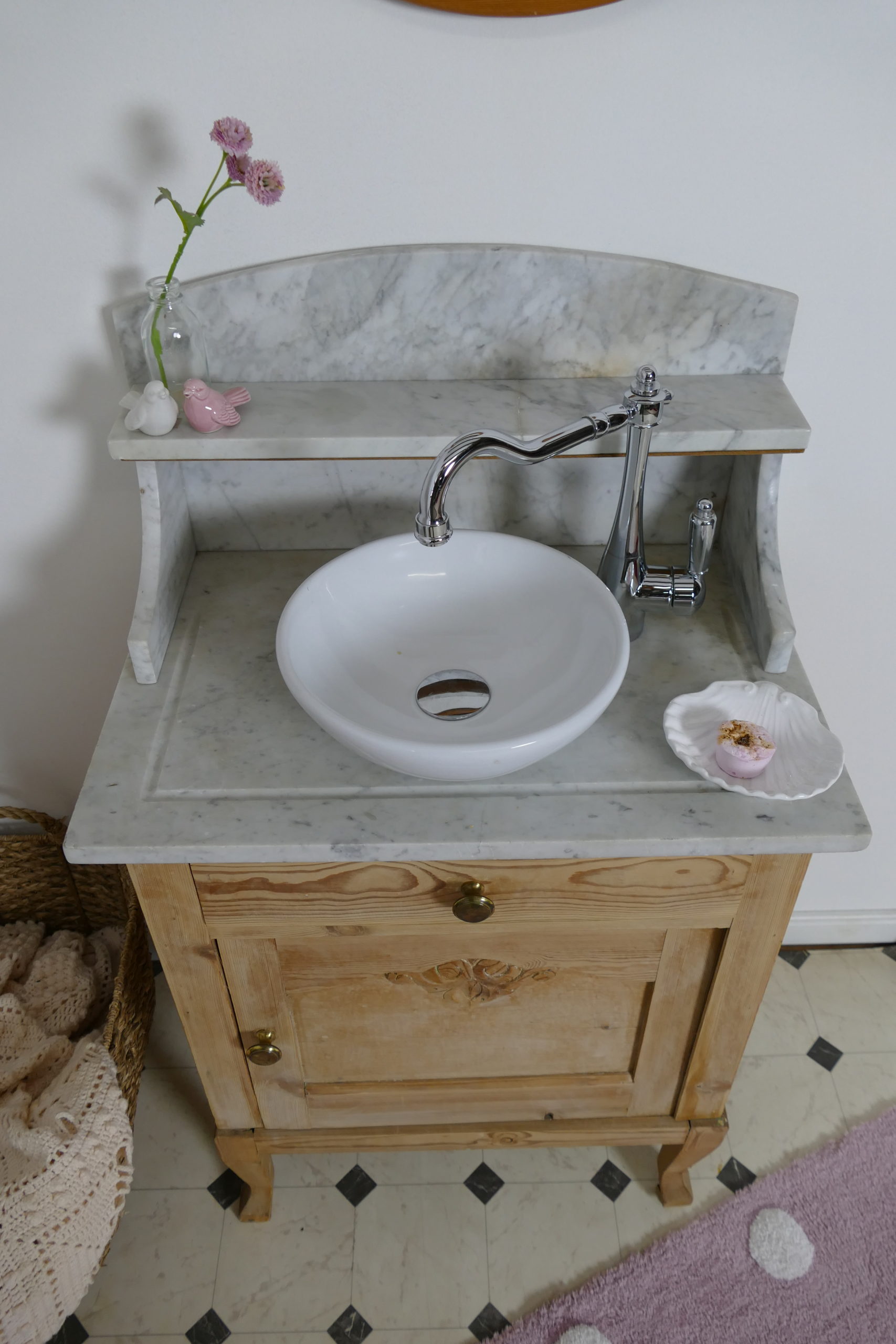 »Sweetie«-Waschtisch-Naturholz-mit-Marmorplatte-dänischer Landhausstil-Leben-aif-dem-Land