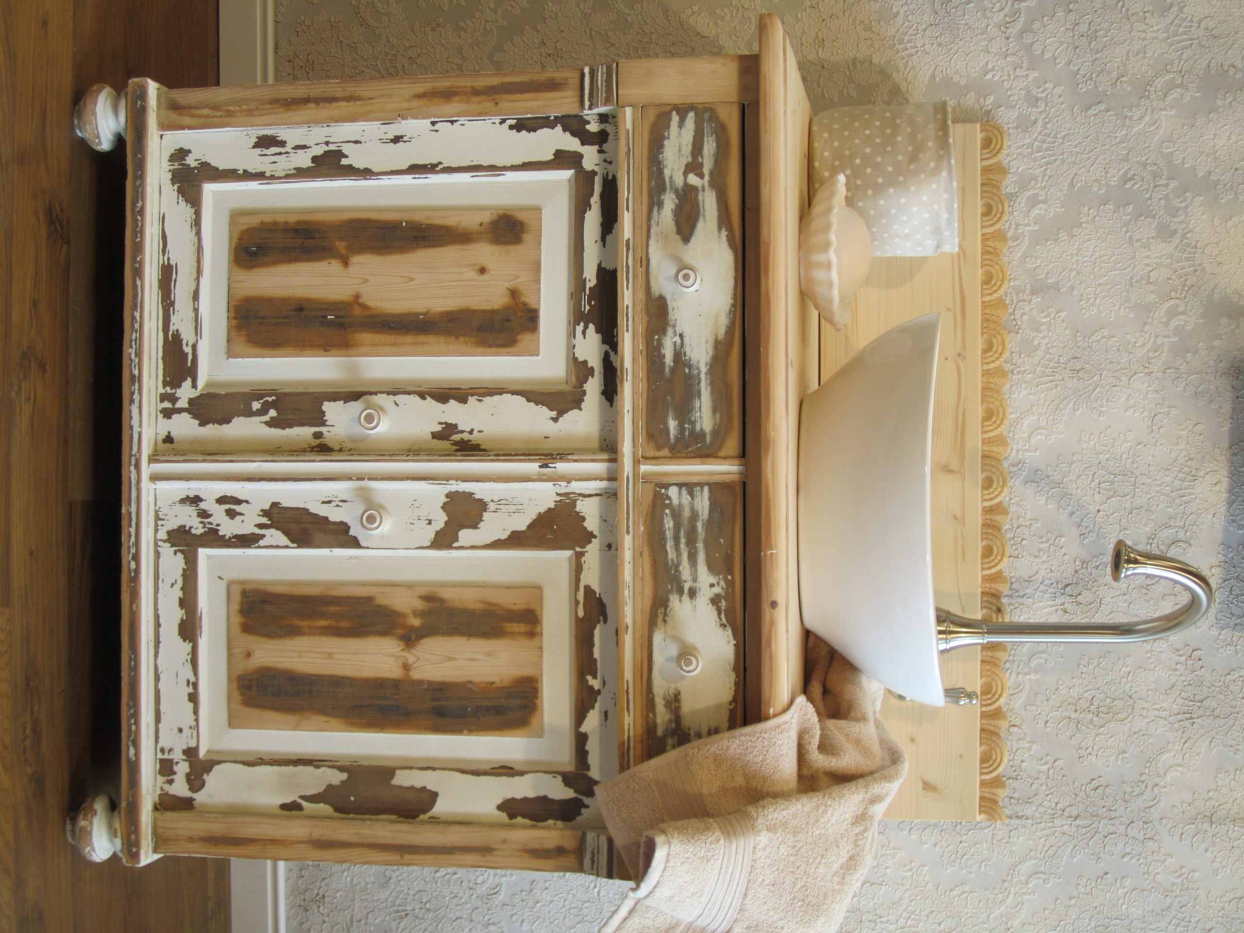 Im ersten Bild steht der Waschtisch vor einer weißen, opulent gemusterten Tapete. Dank des hellen und zurückhaltenden Hintergrundes kommt der Waschtisch mit seinem individuellen Outfit gut zur Geltung. Oder erscheint der Waschtisch im lässigen Shabby Chic Look bei genauerer Betrachtung etwas blass um die Nase?