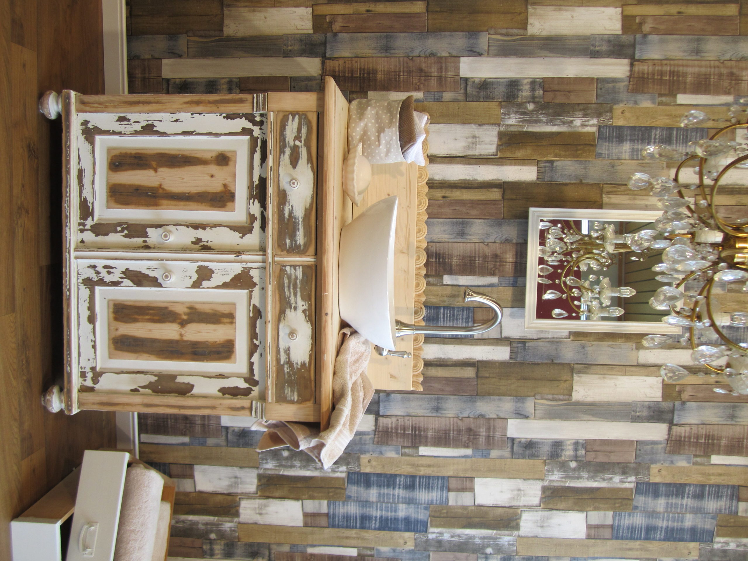 Verwitterte Holzbretter sorgen bei dem dritten Hintergrund für eine farbige Mischung, die auf den ersten Blick fast überfrachtet wirkt. Wir finden, dieser farbenfrohe Hintergrund bringt den Shabby Chic Look des Waschtisches 50 Shades of brown außerordentlich gut zur Geltung.